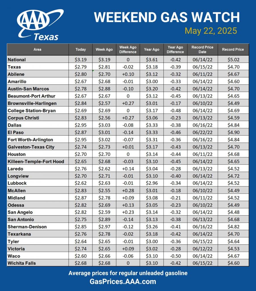 Nationally, gas prices are holding steady at $3.19 per gallon, 42 cents lower than this time last year. This marks the lowest average price for Memorial Day weekend travel in Texas since 2021, when the average was $2.71 per gallon, according to AAA Texas.