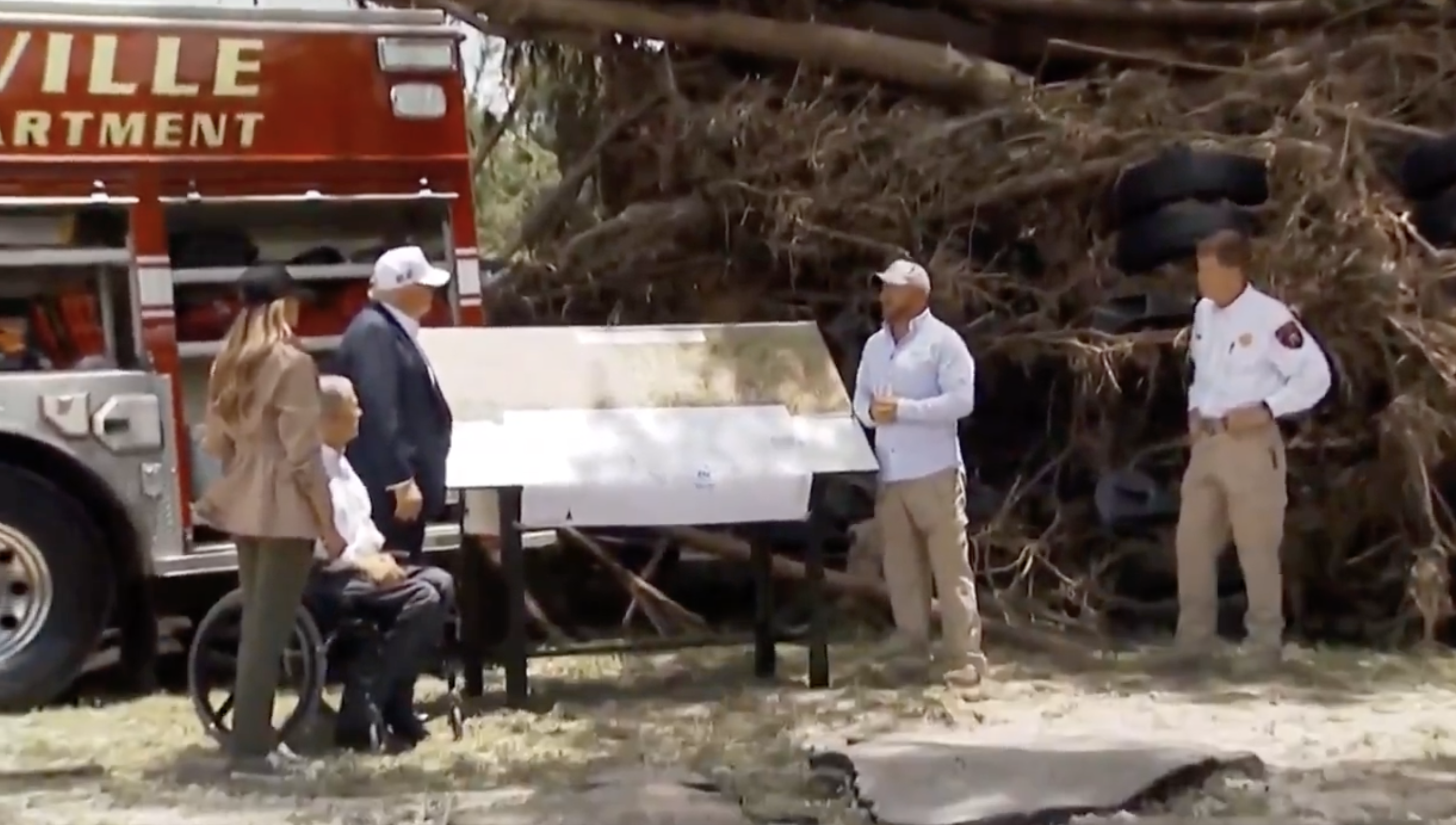 Air Force One touched down at Kelly Field at Joint Base San Antonio-Lackland shortly after noon before the president and first lady Melania Trump traveled by Marine One to survey damage across Kerrville, Ingram and Hunt. The tour included additional Osprey aircraft carrying support staff and journalists.