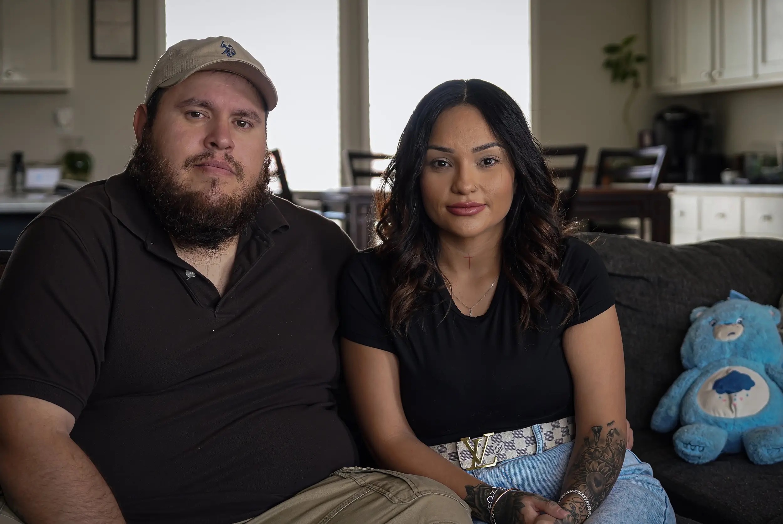Alfredo and Daniela Santos are carrying their sleeping 4 year old daughter to their home in Midland, Texas on October 6, 2025. They received her from the Midland ISD SPED bus after it drops her off directly to their home. Daniella holds her daughters backpack, her daily stuffed animal of choice, and her book.