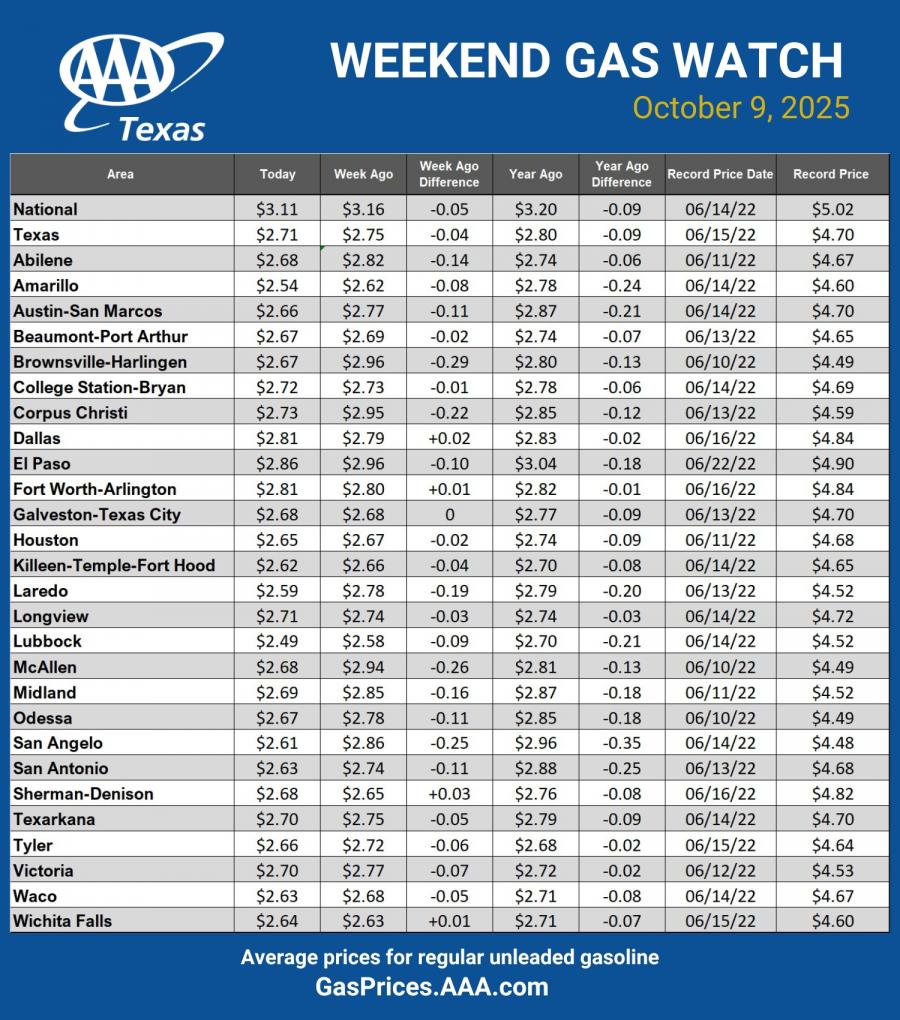 “Drivers are getting some welcome relief at the pump as gasoline demand falls to its lowest level in months,” said Daniel Armbruster, AAA Texas spokesperson. “With the switch to more affordable winter-blend fuel and higher gasoline inventories, pump prices are likely to keep trending lower in the coming weeks — good news for Texans hitting the road this fall.”